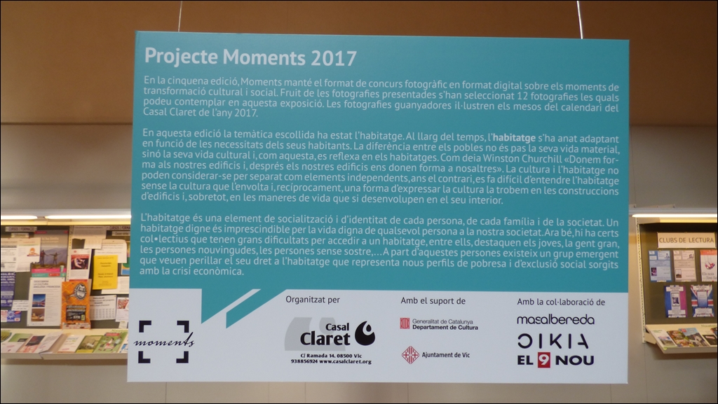 El material exposat són les fotografies que es van presentar al Concurs de fotografia Moments, i que formen part del calendari del Casal Claret 2017. En aquesta ocasió la temàtica és la cultura de l’habitatge.