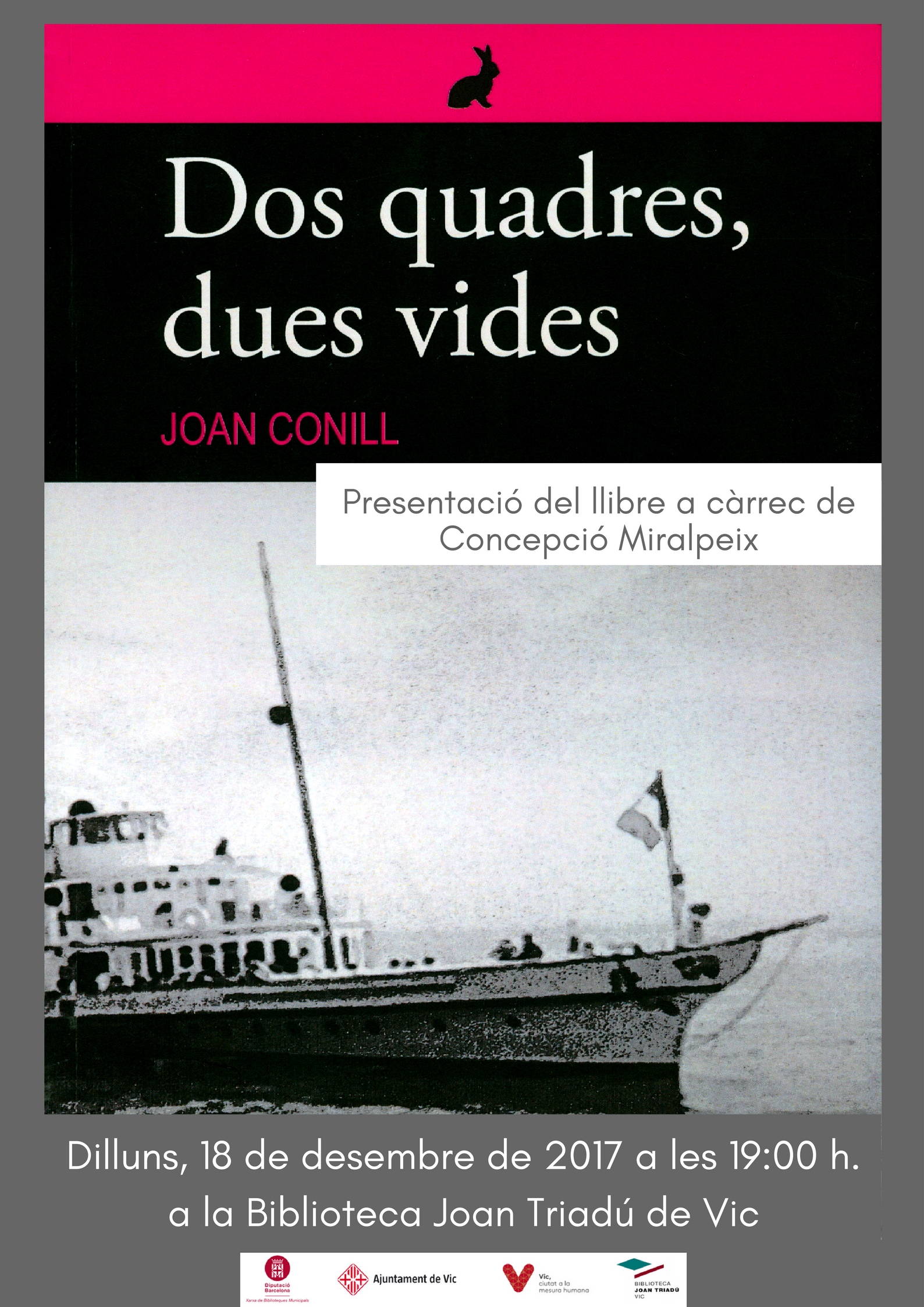 El dilluns 18 de desembre es va fer la presentació del llibre Dos quadres, dues vides de Joan Conill. Es tracta de la primera incursió al món de la novel·la de ficció d’un autor que ja havia publicat llibres sobre excursionisme i rutes en BTT per Osona.