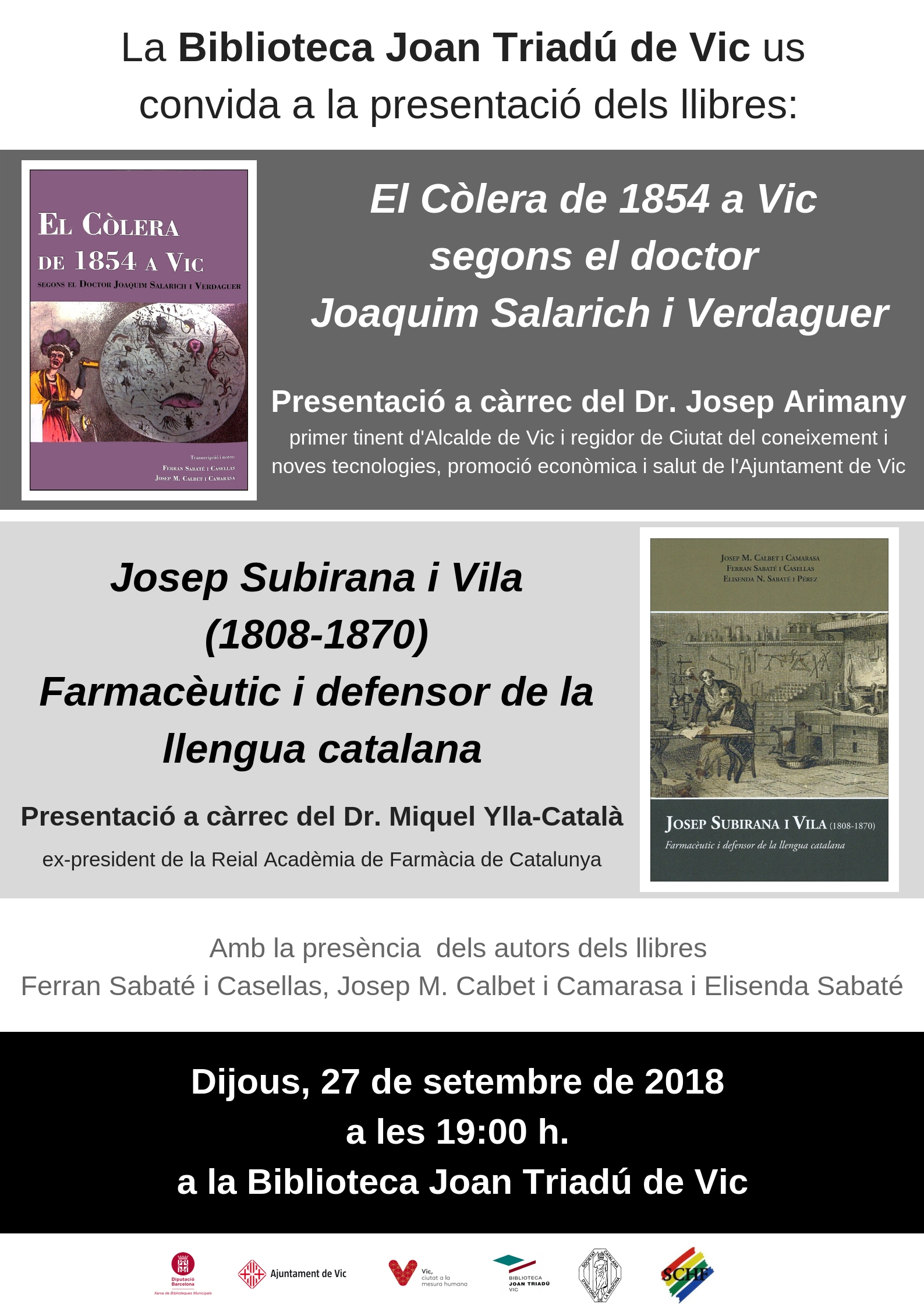 Els llibres són El còlera de 1854 a Vic segons el doctor Joaquim Salarich i Verdaguer i Josep Subirana i Vila (1808-1870) Farmacèutic i defensor de la llengua catalana.