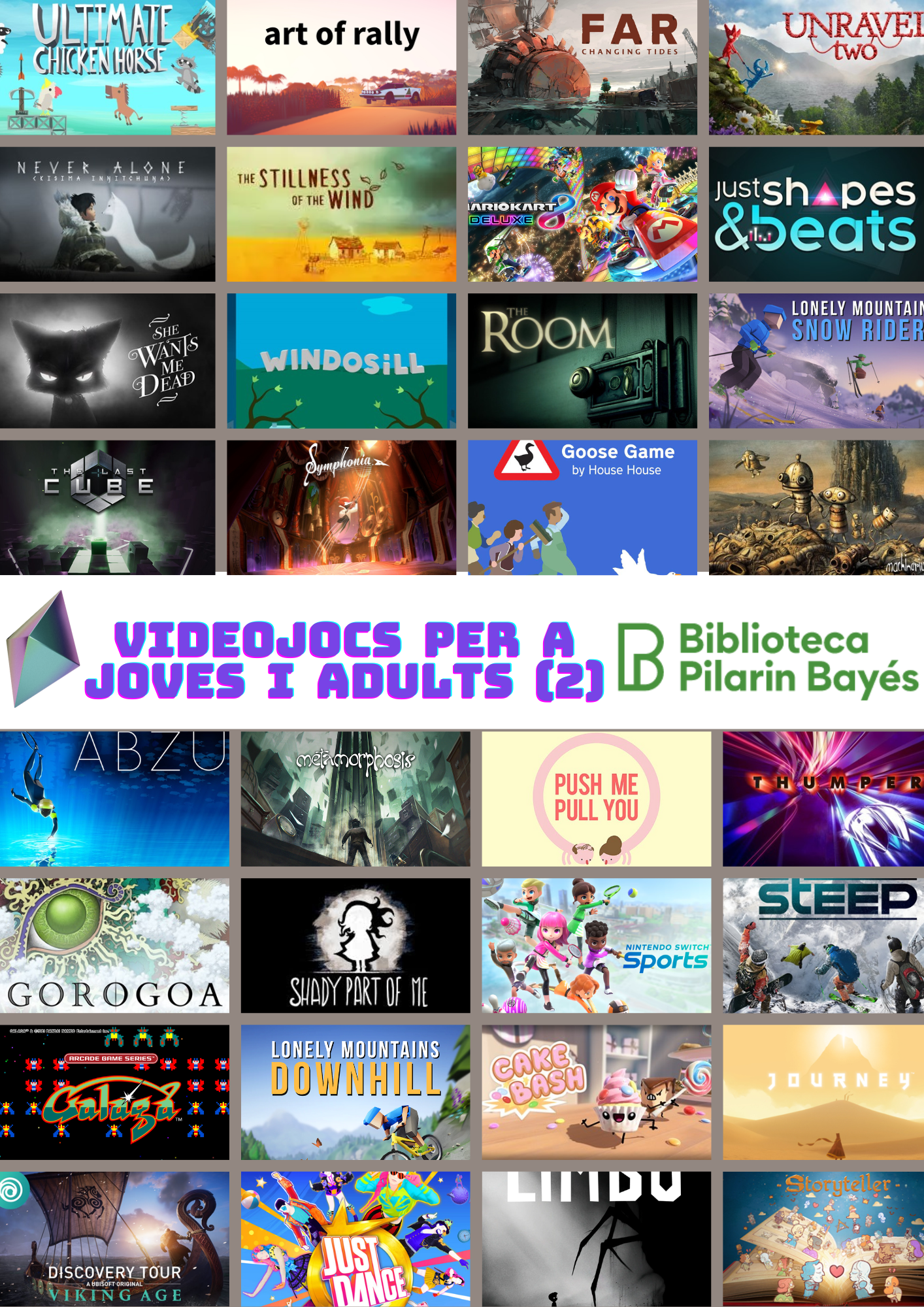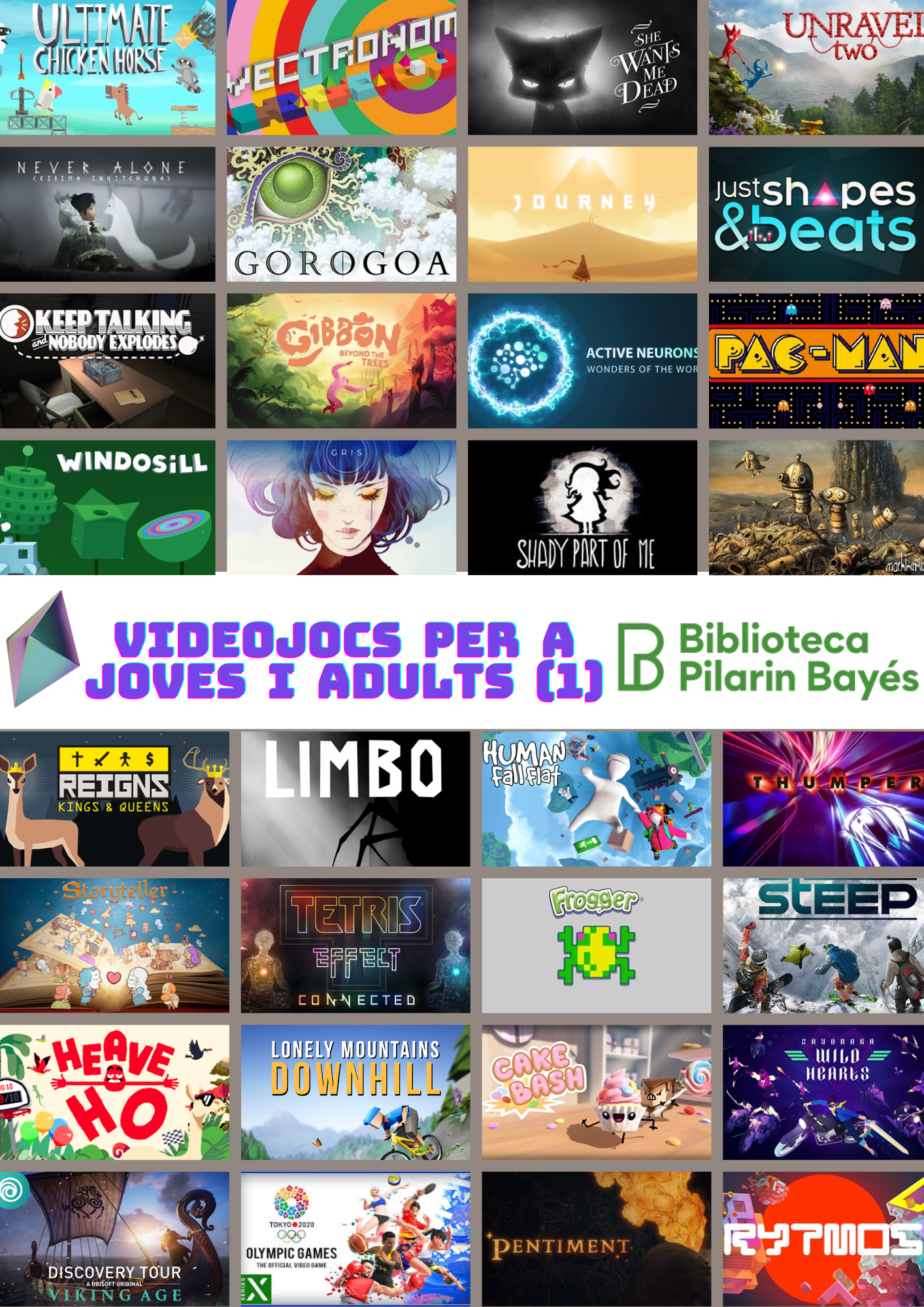 El món dels videojocs és molt plural però massa sovint es juga molt al mateix tipus de jocs: d’esports, de guerra, d’habilitats… Des de la biblioteca us animem a descobrir un altre tipus de jocs: d’exploració, d’observació, de cooperació… N’hi per a totes les edats!