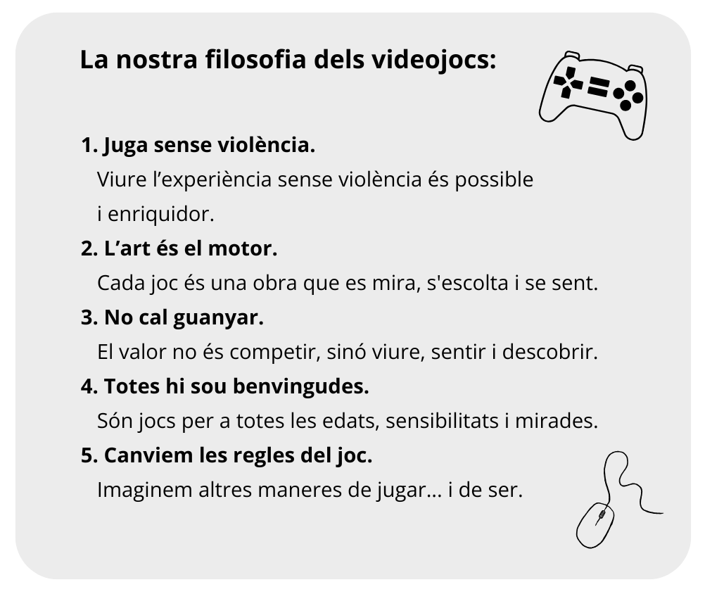 La selecció, a més, vol allunyar-se de qualsevol joc que faci servir mecàniques de combat i violència, ja que considerem que està sobrerepresentada al món del videojoc i és contradictòria amb els objectius de pluralitat cultural de la biblioteca.