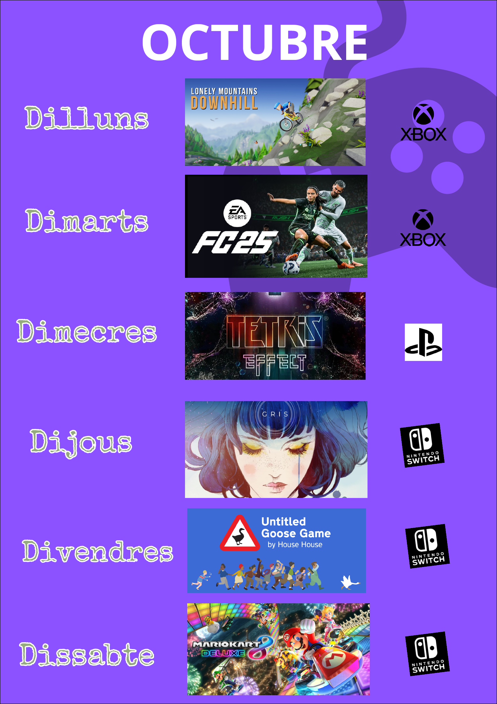Aquí teniu la programació dels videojocs que estaran disponibles durant el mes d’octubre a la Biblioteca Pilarin Bayés de Vic.
