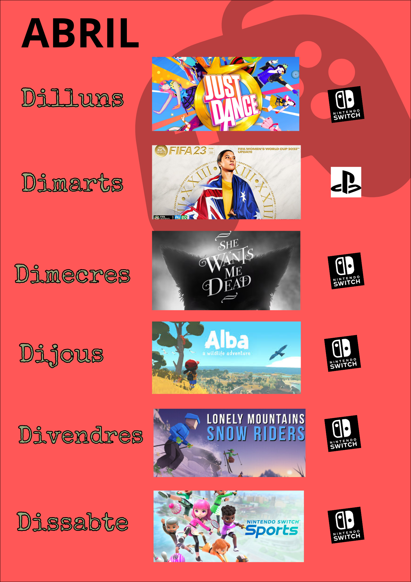 Aquí teniu la programació dels videojocs que estaran disponibles durant el mes d’abril a la Biblioteca Pilarin Bayés de Vic.