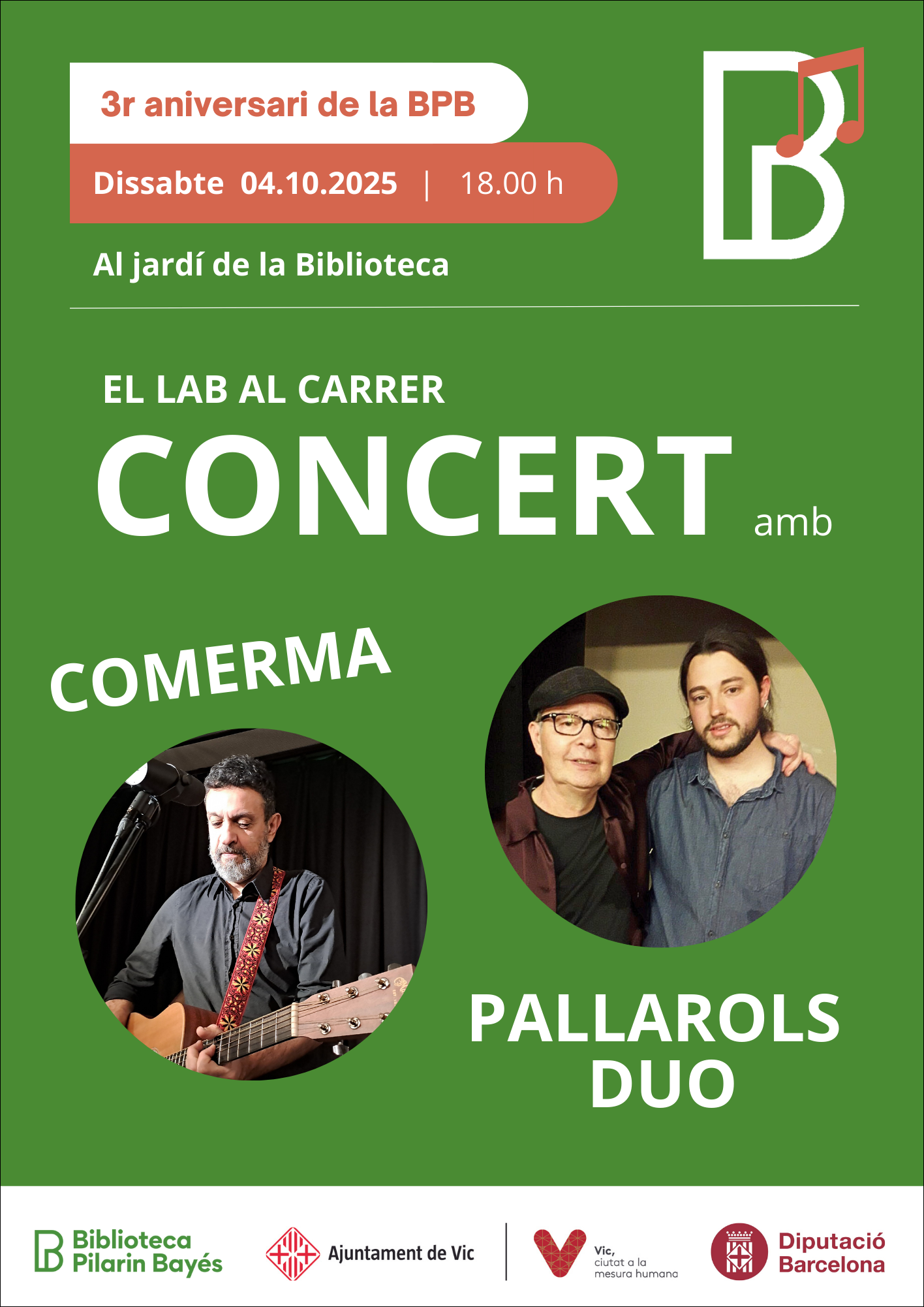 La Biblioteca Pilarin Bayés de Vic us convida a celebrar el 3r aniversari de la Biblioteca Pilarin Bayés de Vic amb un concert al jardí de la Biblioteca a càrrec de Comerma i Pallarols Duo.