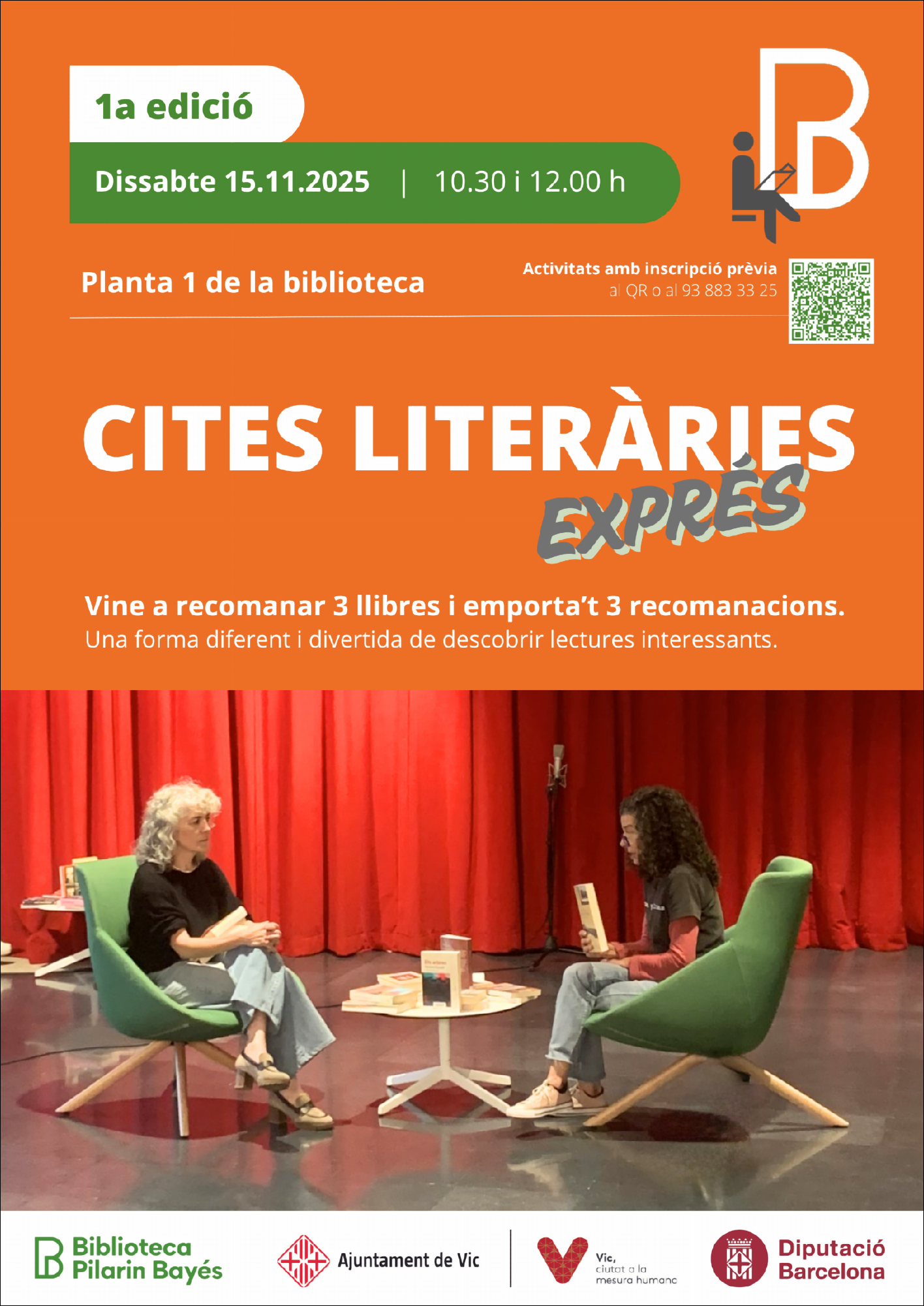 La Biblioteca Pilarin Bayés de Vic us convida a la 1a edició de Cites literàries exprés, una activitat divertida i dinàmica per compartir recomanacions de llibres.