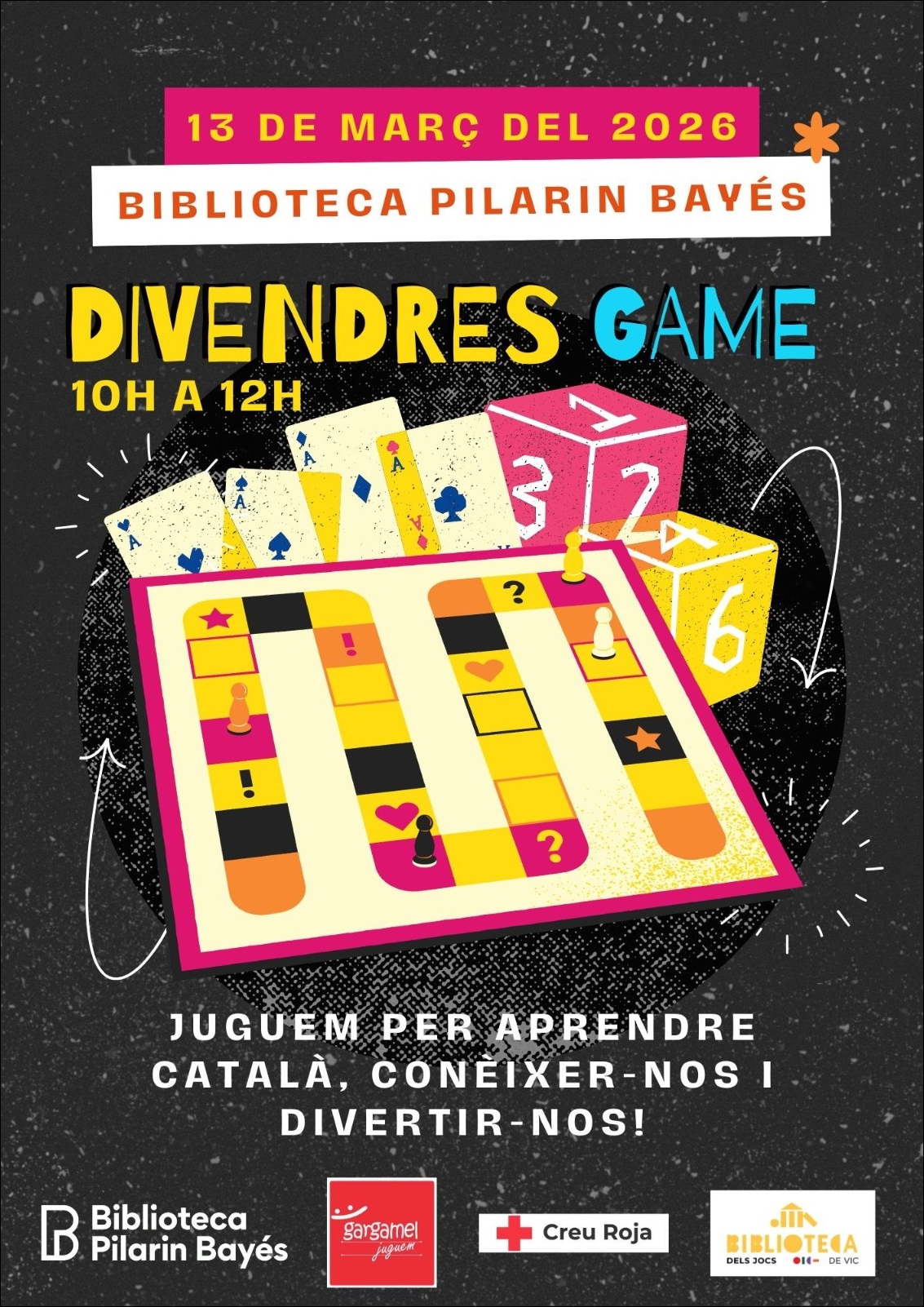 La Biblioteca Pilarin Bayés us convida a la sessió Divendres game, un espai de trobada on el joc de taula és el protagonista i que té per objectiu esdevenir un espai de socialització, d’aprenentatge de la llengua catalana per persones nouvingudes i una eina educativa per treballar i incidir en altres àmbits de les persones participants en un ambient distès i en comunitat.