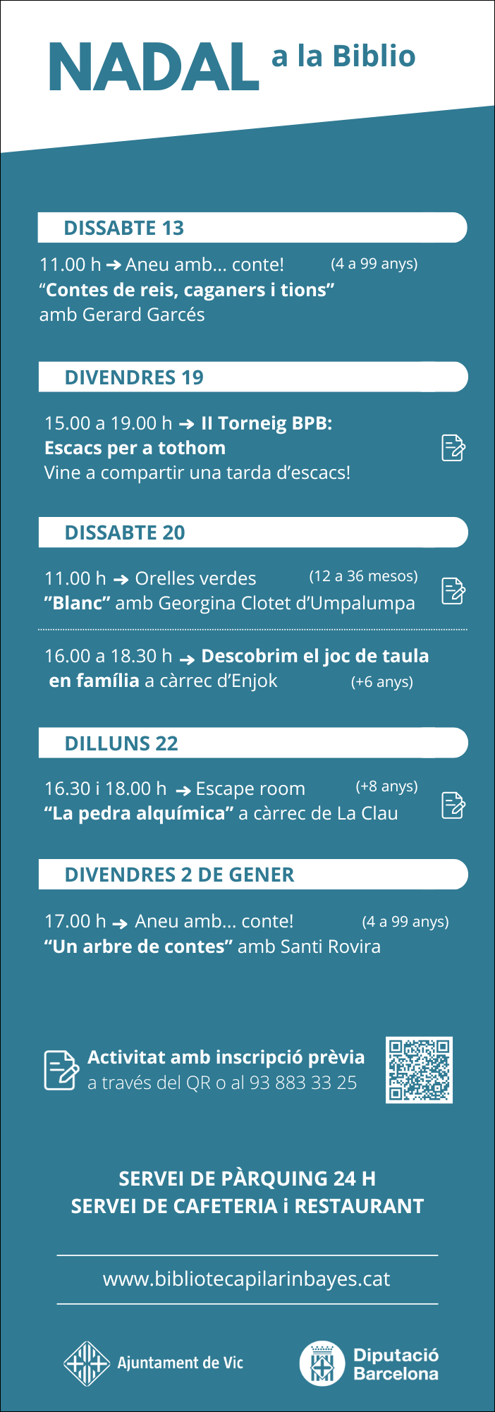 Aquí teniu les activitats previstes a la Biblioteca Pilarin Bayés de Vic, resumides a la Tira del mes de desembre i Nadal de 2025: