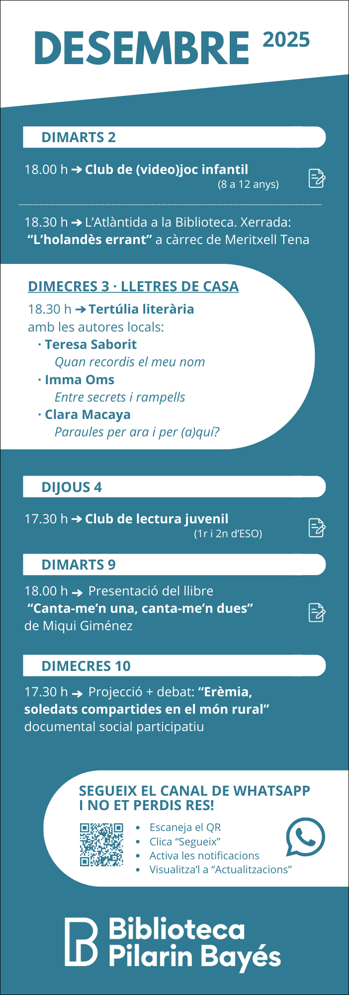 Aquí teniu les activitats previstes a la Biblioteca Pilarin Bayés de Vic, resumides a la Tira del mes de desembre i Nadal de 2025: