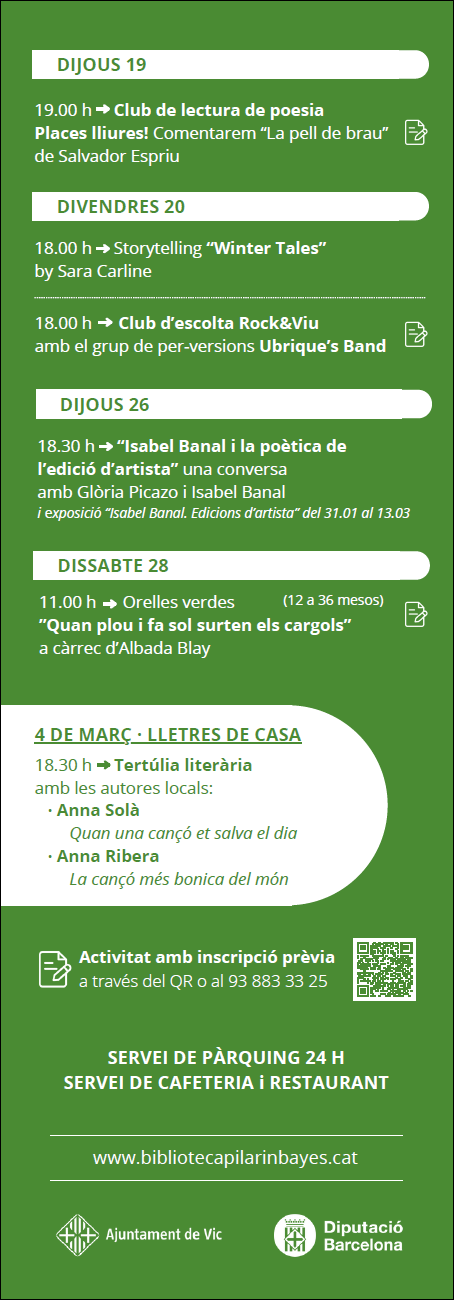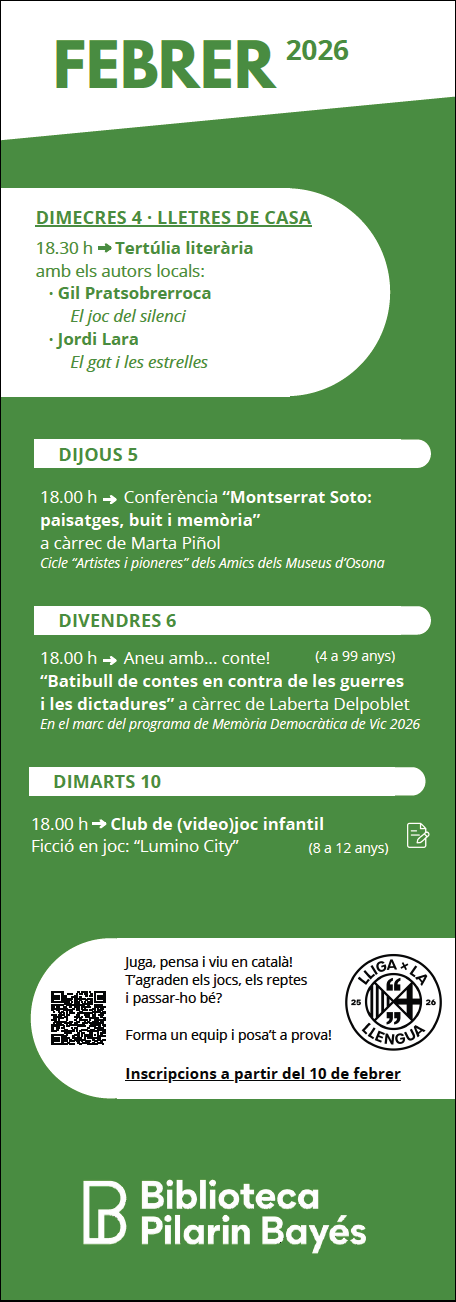 Aquí teniu les activitats previstes a la Biblioteca Pilarin Bayés de Vic, resumides a la Tira del mes de febrer de 2026: