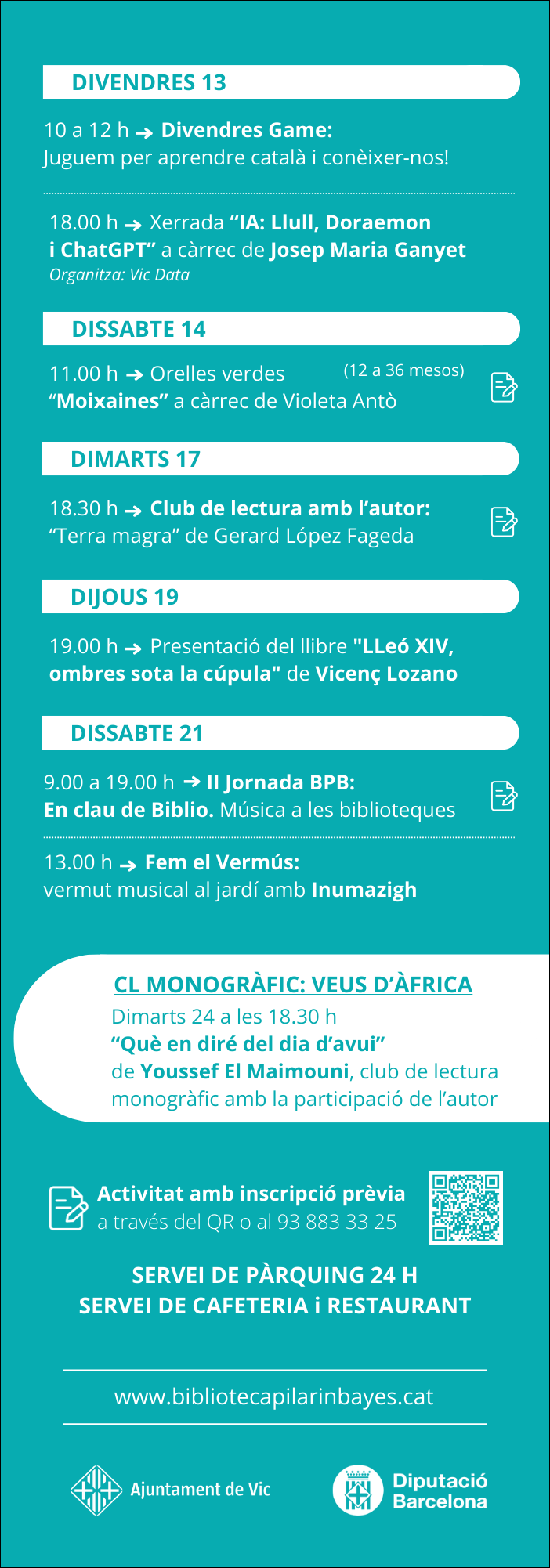Aquí teniu les activitats previstes a la Biblioteca Pilarin Bayés de Vic, resumides a la Tira del mes de març de 2026: