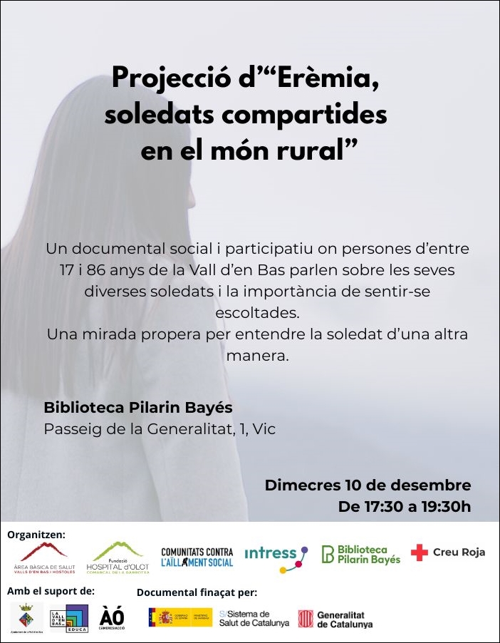 «Un documental social i participatiu on persones d’entre 17 i 86 anys de la Vall d’en Bas parlen sobre les seves diverses soledats i la importància de sentir-se escoltades. Una mirada propera per entendre la soledat d’una altra manera.»